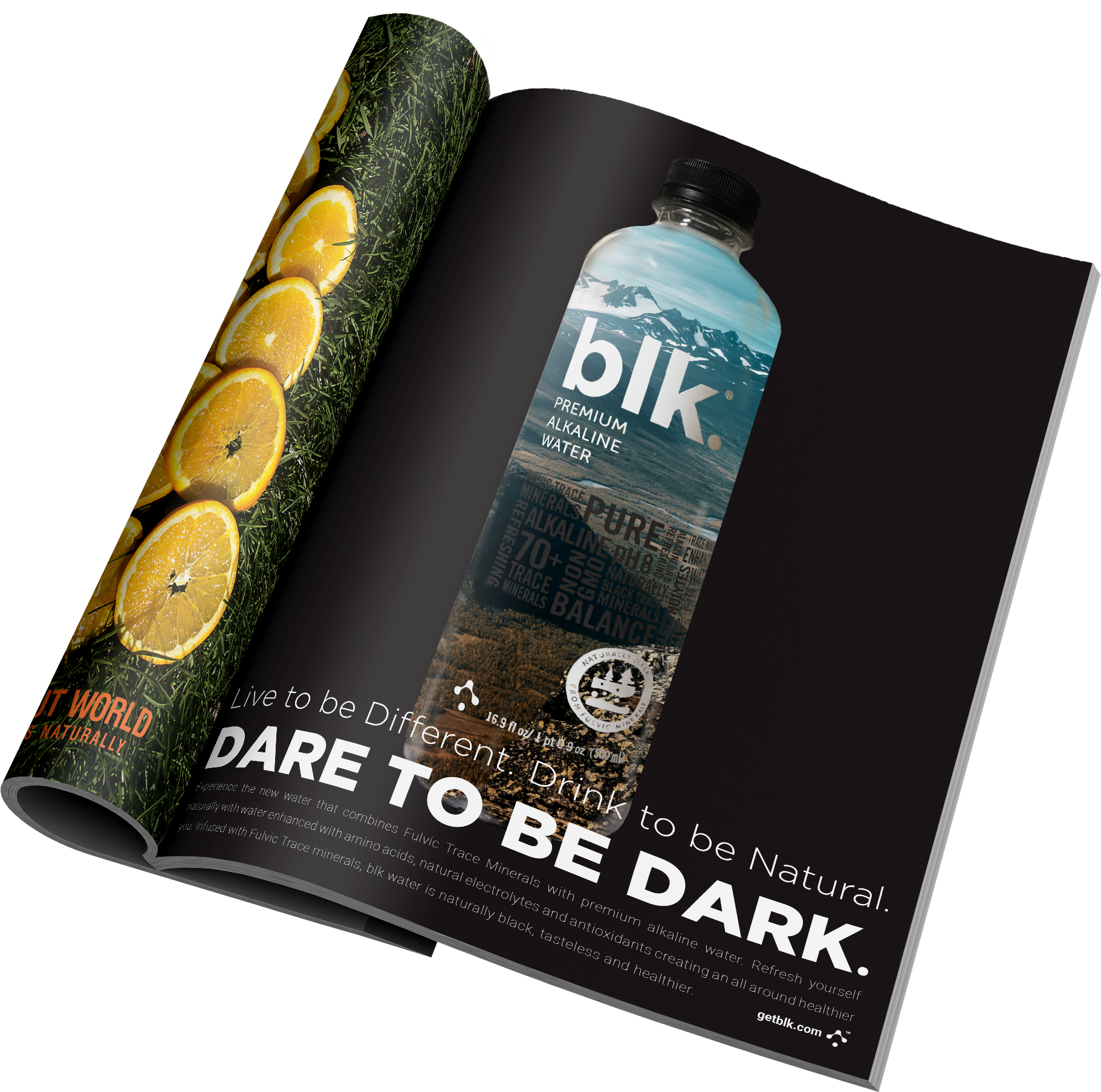 Full page advertisement featuring blk. water, the ad contrasts black and a nature scene which references the water’s dark but natural color. The idea of the ad was to tempt you, as if you needed to be daring enough to try something different. The font and color scheme coincides with the blk. brand.